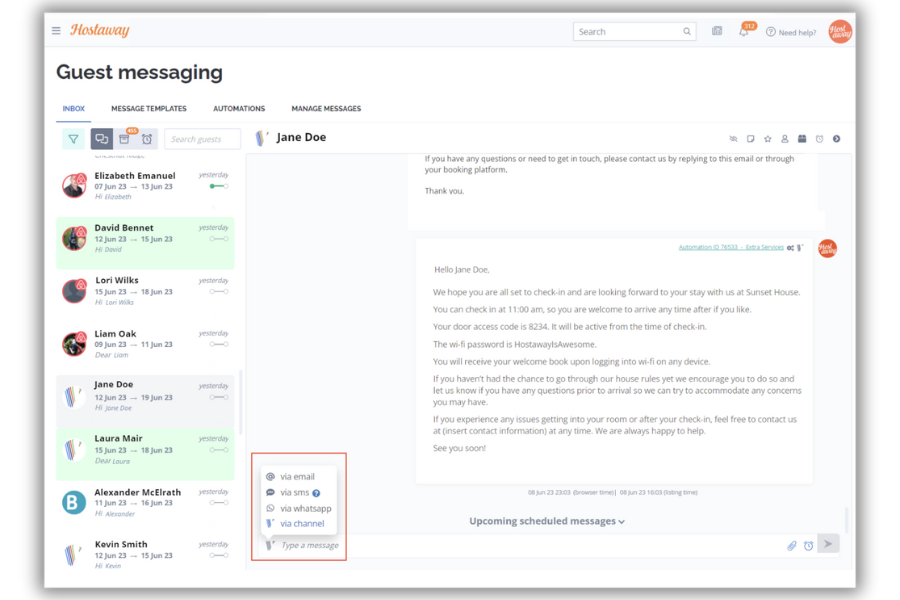 What does this mean? Where before you could only email or SMS your Vrbo guests, now you can directly message them on Vrbo from your Hostaway Inbox.
